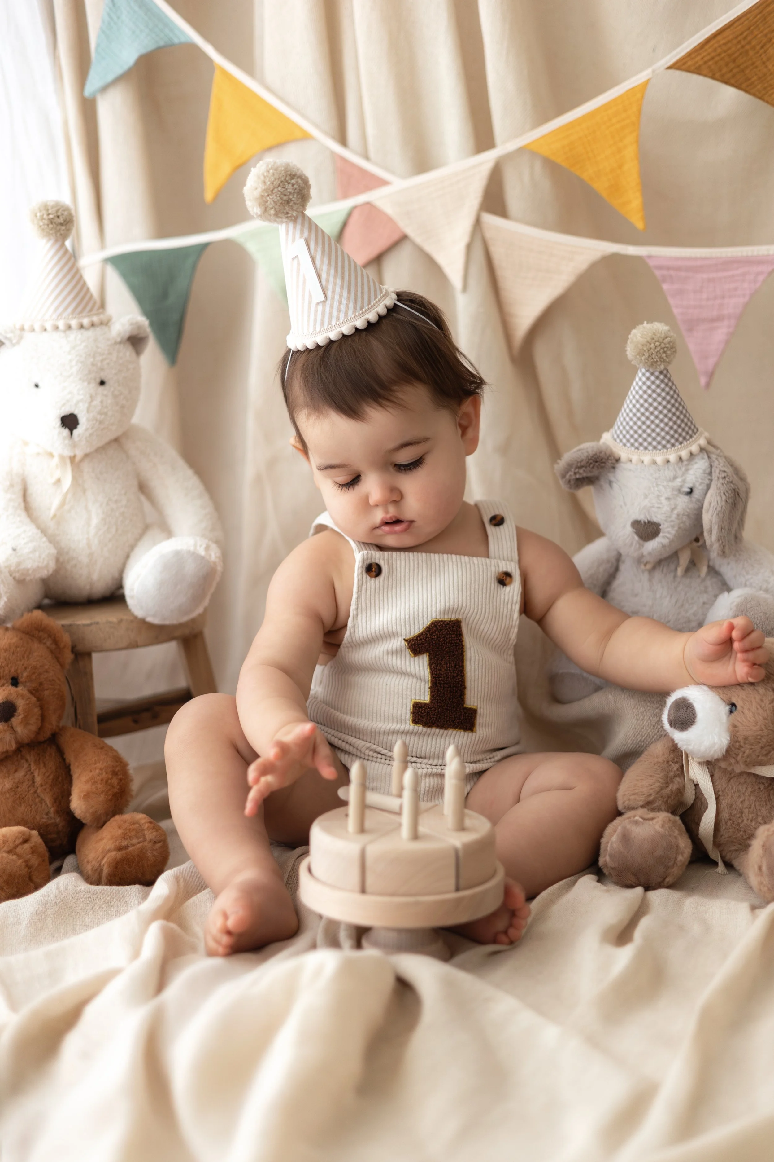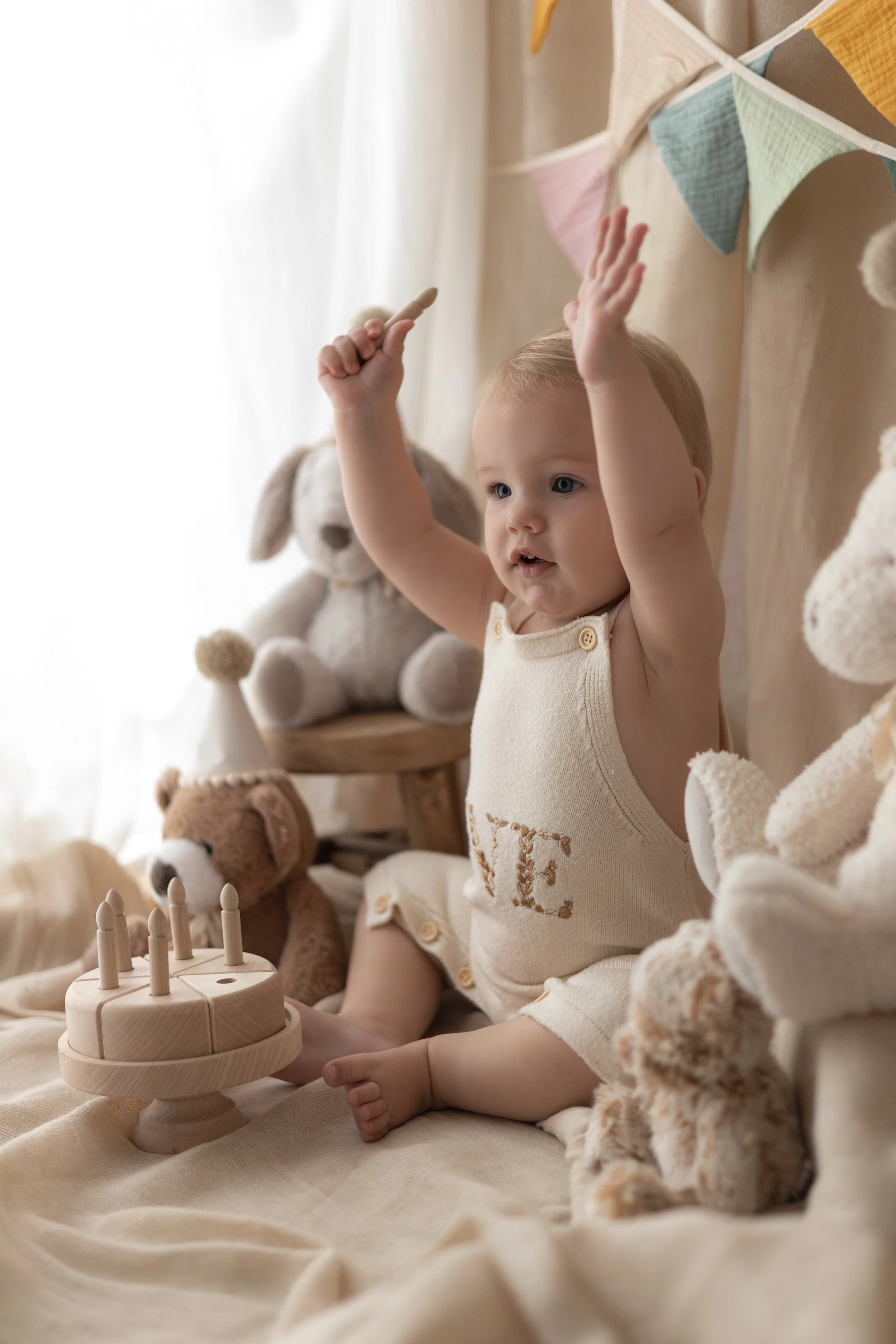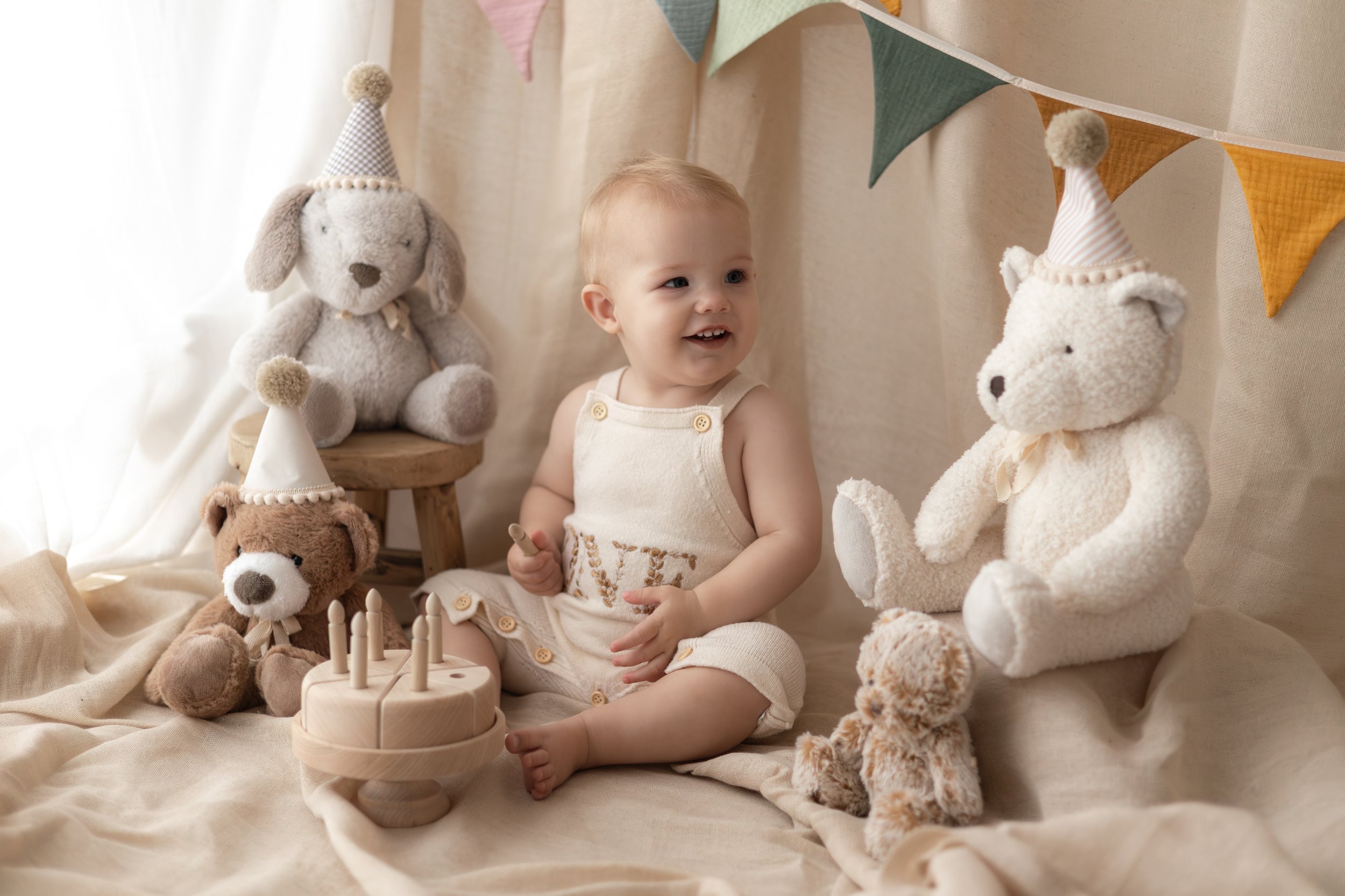 For first birthdays, I love to begin with a timeless teddy bear picnic setup, followed by relaxed family portraits, and finish with a joyful, messy bathtub session if your little one is still in good spirits.